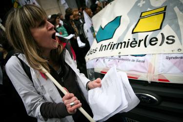 Infirmière chantant des slogans devant le camion-sono en tête de cortège.