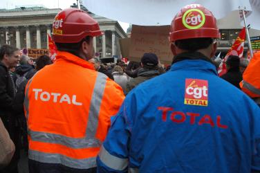 Devant la Bourse travailleur de Total en conférence de Presse avec syndicats, Cgt, Cfdt, Fsu, Unsa, Solidaires. Absence de Fo, Cfe-Cgc, Cftc.