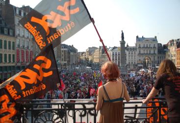 des militants SUD Etudiants brandissent des banderoles en hommage à leur camarade, Clément Méric, assassiné par un groupe de l'extrème droite radicale.