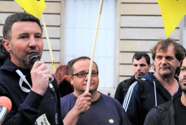Gaël Quirante postier du 92 au rassemblement PAS DE CODE DU TRAVAIL SUR ORDONNANCE