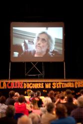 Stéphane Hessel intervenant à la tribune à la fin de la manifestation.