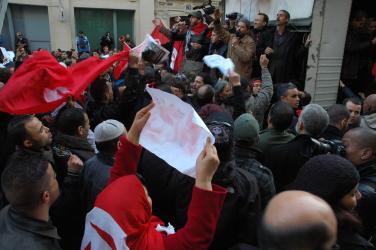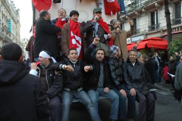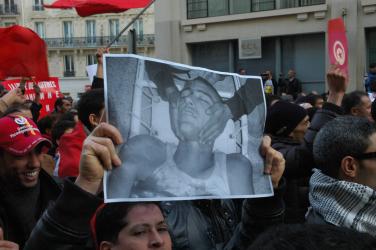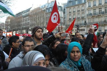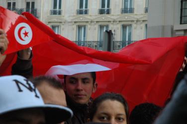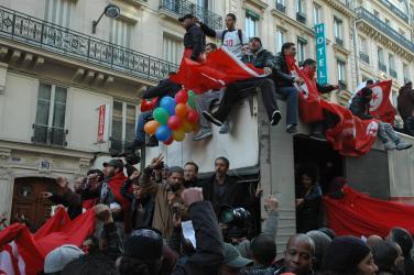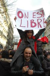 jeune Tunisienne sur les épaules de son père avec affichette on est libre