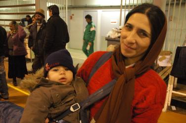 Femme et enfant au gymnase de Massy à 7h00 du matin, avant expulsion.