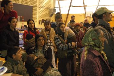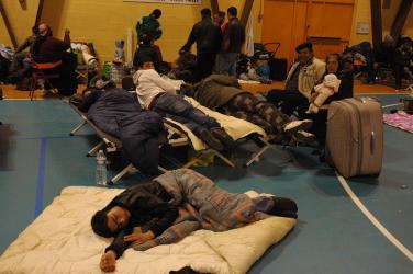 Femmes et enfants en réveil au gymnase de Massy essonne à 7h00 du matin, avant expulsion.