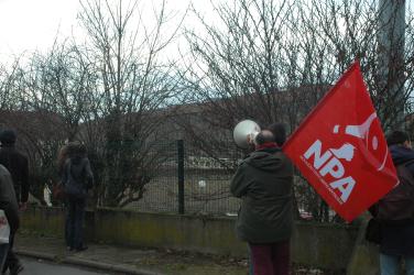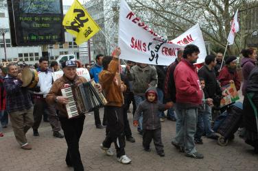 Roms Roumains devant drapeau Npa et Mrap à Evry.