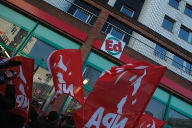 Sigle ED d'Evry, magasin en grève depuis six semaines et drapeaux Npa.