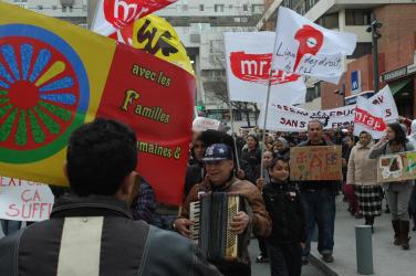 Rroms Roumains drapeaux et banderole manifestation Evry.