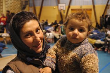 Jeune femme Roms et son enfant à 7h du matin au Gymnase de Massy.