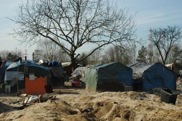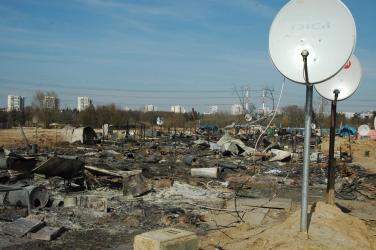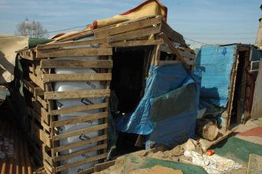 Intérieur de cabanne de Roms non incendiée camp de Massy.