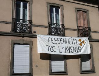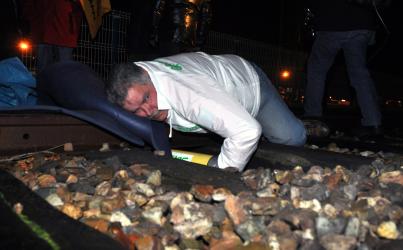 Olivier Besancenot assis avec les manifestants anti-nucléaires