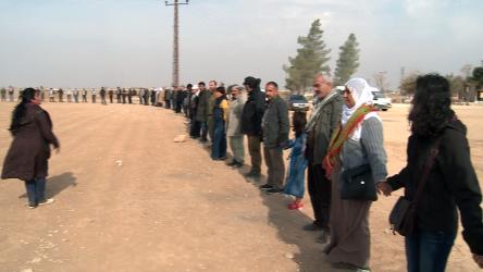 Les Kurdes venus de partout et des membres des délégations étrangères dont Npa se mettent en ligne et forment une chaîne humaine.