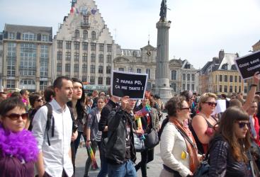 foule défilant lors de la marche des fiertés.On y distingue les banderoles et drapeaux du NPA, SOS HOMOPHOBIE, du Planning Familial
