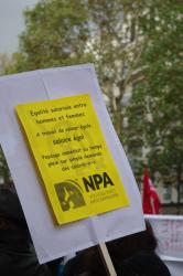 autocollant du npa : notre identité est internationales, en arrière plan la manifestation