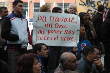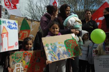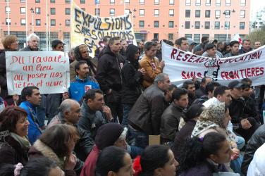 Pancarte des Roms Du travail un lieu ou poser nos têtes et vivre!