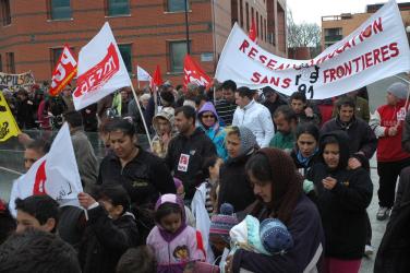 Roms Roumains devant drapeau Npa et Mrap à Evry.