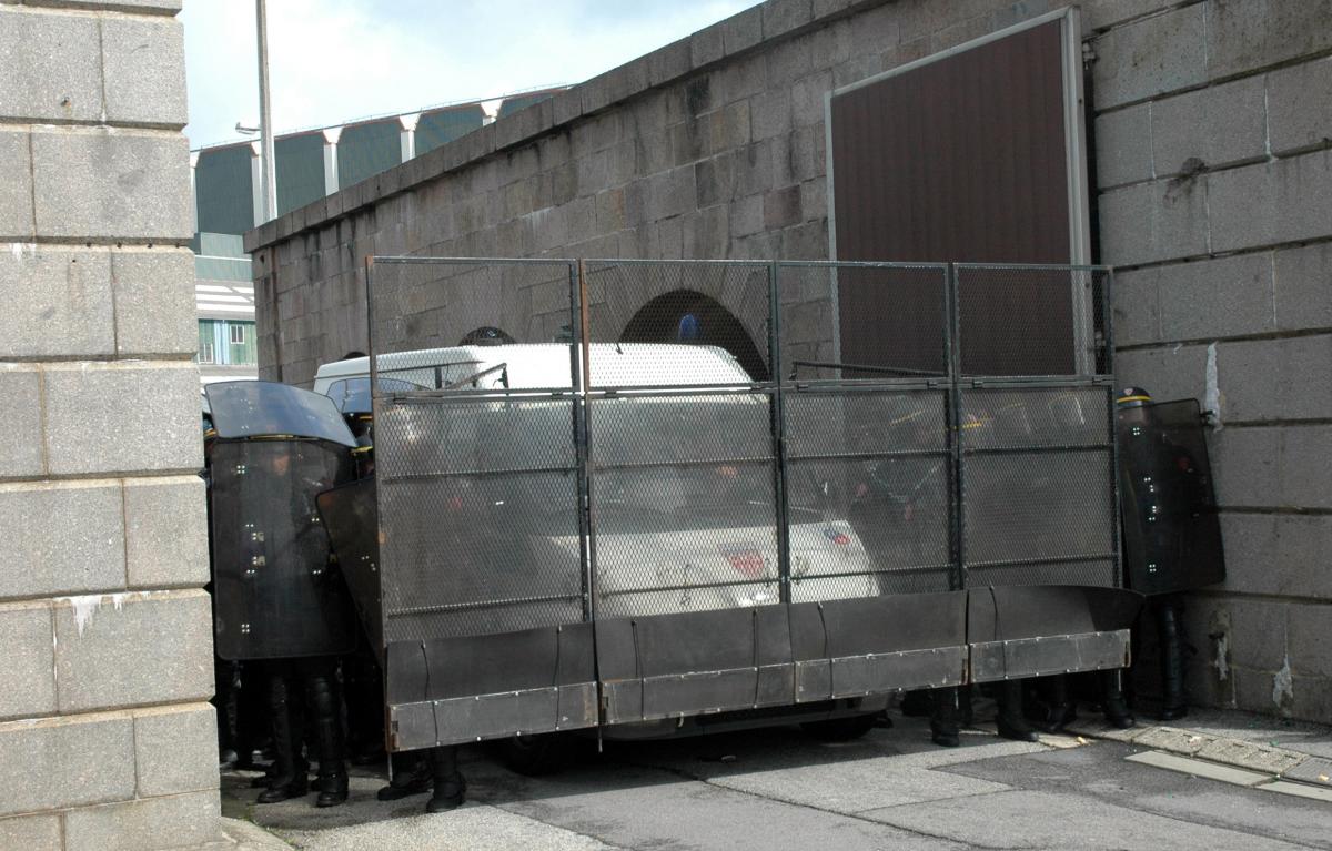 CRS bloquant l'entrée de l'arsenal de Cherbourg