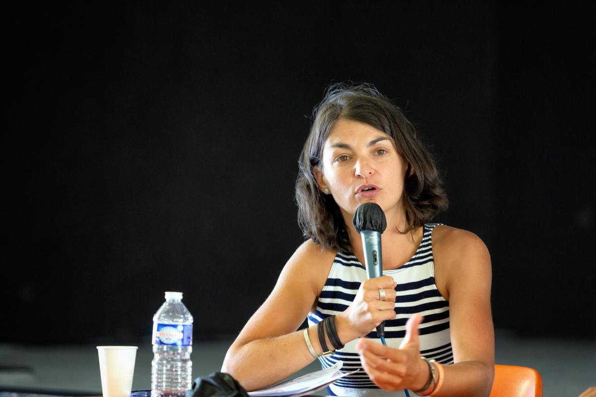 France, Port Leucate, 2021-08-22. Aurelie Trouve, spokesperson of Attac during the summer university of the NPA. Photograph by Martin Noda / Hans Lucas