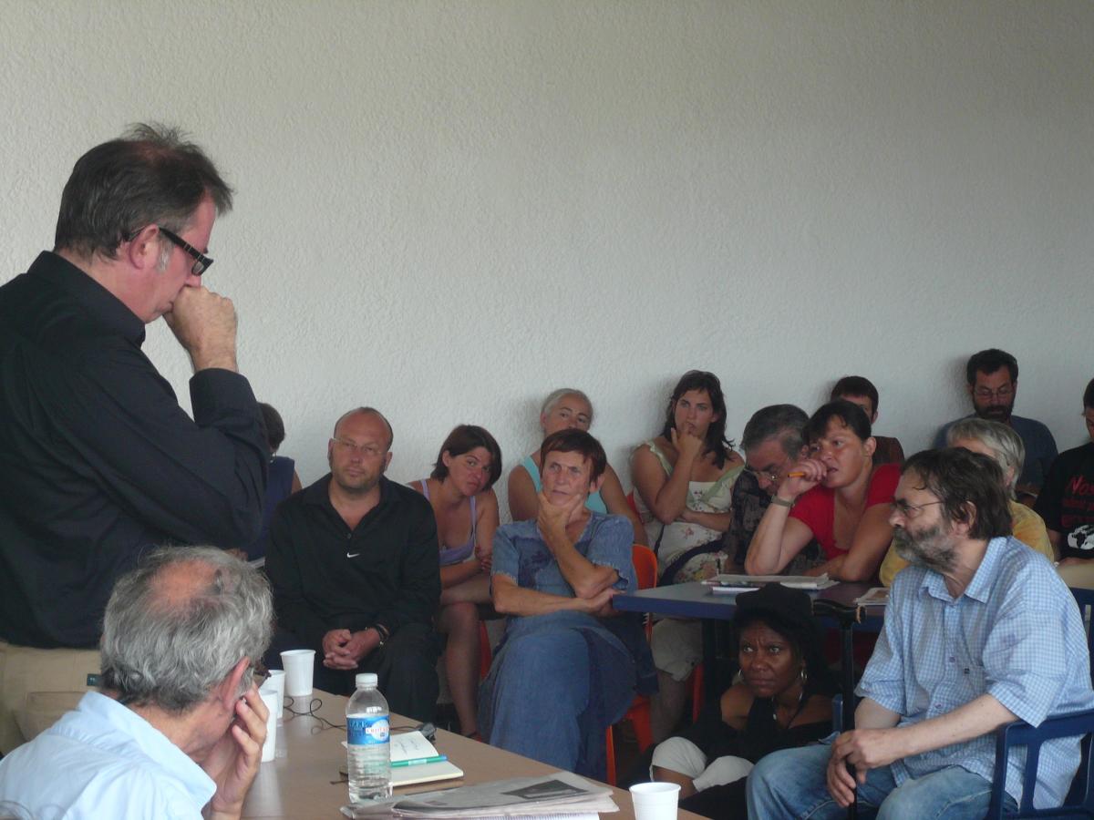 Université d'été de la LCR 2007 à Port-Leucate du 23 au 29 août. Plus de 1100 personnes. Débat sur la théorie marxisme avec Alex Callinicos (SWP) et Daniel Bensaïd. Port-Leucate/2007/08/CM.