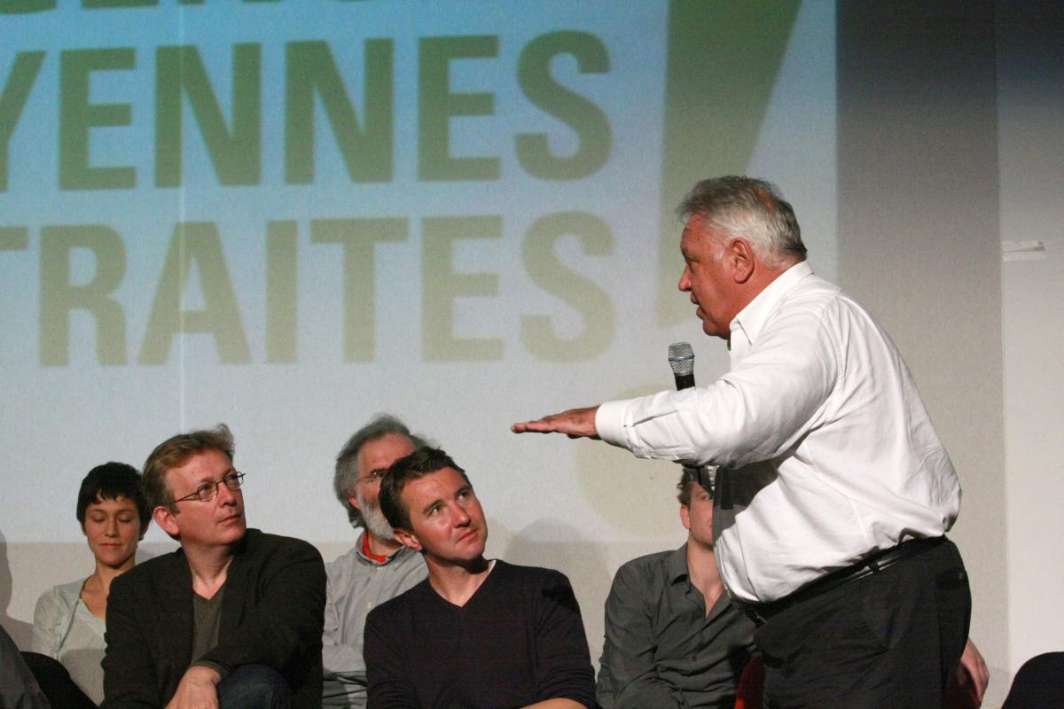 6 mai 2010 meeting unitaire de toute la gauche pour la défense des retraites, à l'appel de la fondation Copernic et de Attac, à la Bellevilloise à Paris dans le 20°arrondissement. Le meeting est présidé par Edwy Plenel de Médiapart.