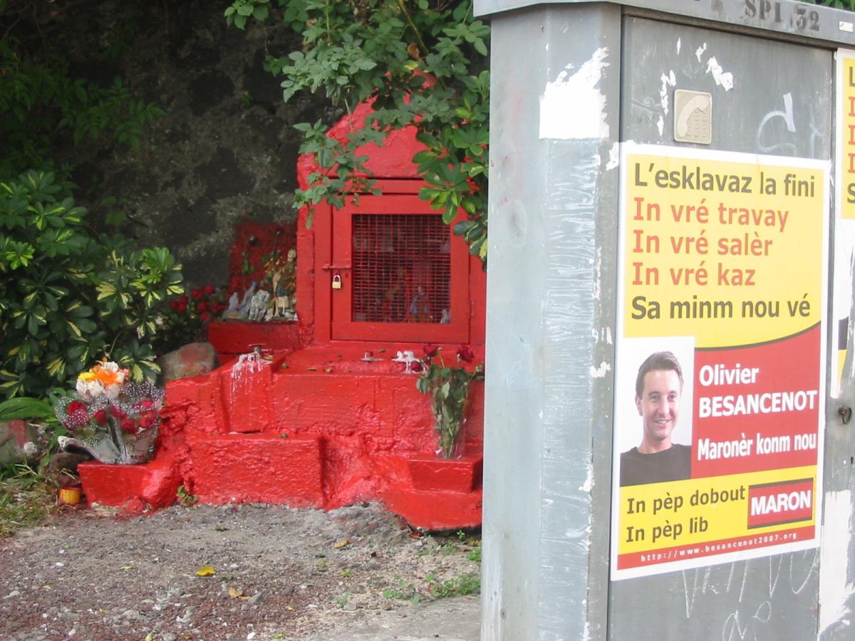 ti bondié St Expédit (chapelle d'un culte créole comme une multitude à La Réunion) et Olivier Besancenot. LA REUNION/2007/04/03/GGrun