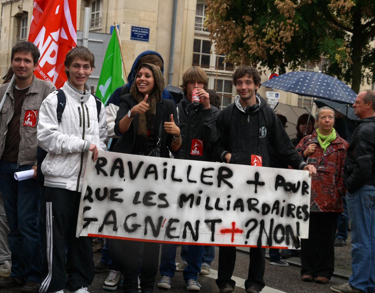 Nancy mardi 7 septembre 2010. Jeunes du NPA54 Sud, lors de la journée de grève et manifestation contre la réforme des retraites.
