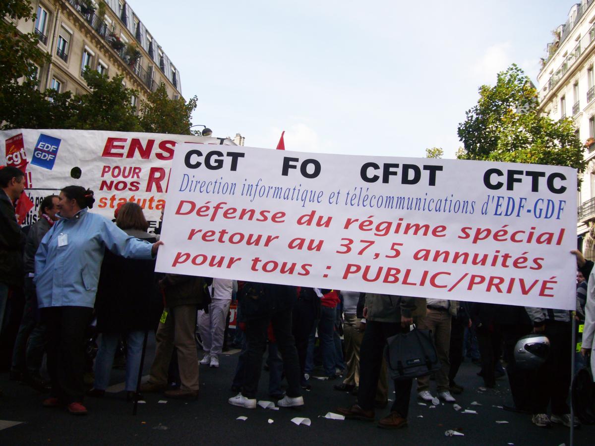 Manif à Paris le 18 octobre 2007 sur la défense des régimes spéciaux. A l'appel de plusieurs syndicats de la SNCF, de la RATP, de la fédérations de la fonction publique. Pour la retraite à 60 ans maximum et le retour aux 37,5 années à taux plein pour tous (public-privé). Cortège avec 25 000 participants. ph:Babar