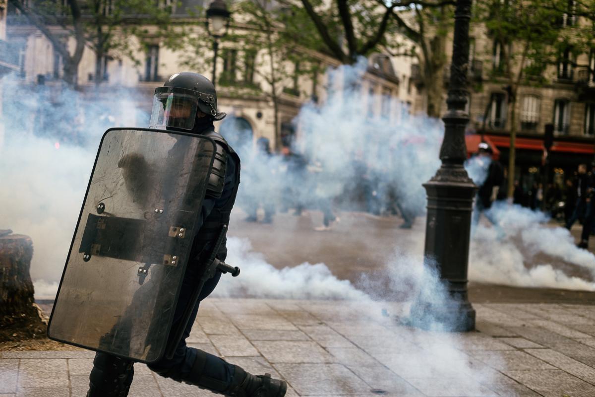 Un CRS charge des manifestant.e.s au milieu des lacrymos