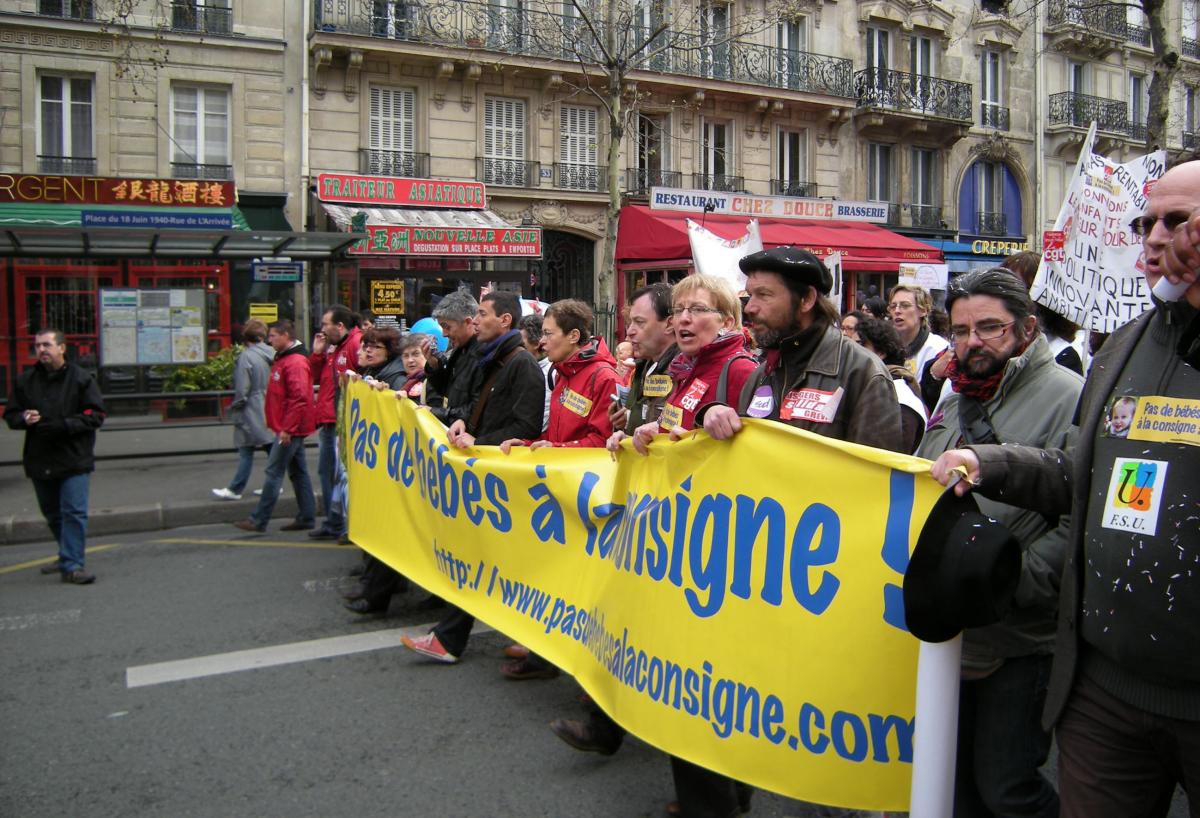 Banderole de tête de la manifestation : Pas de bébé à la consigne