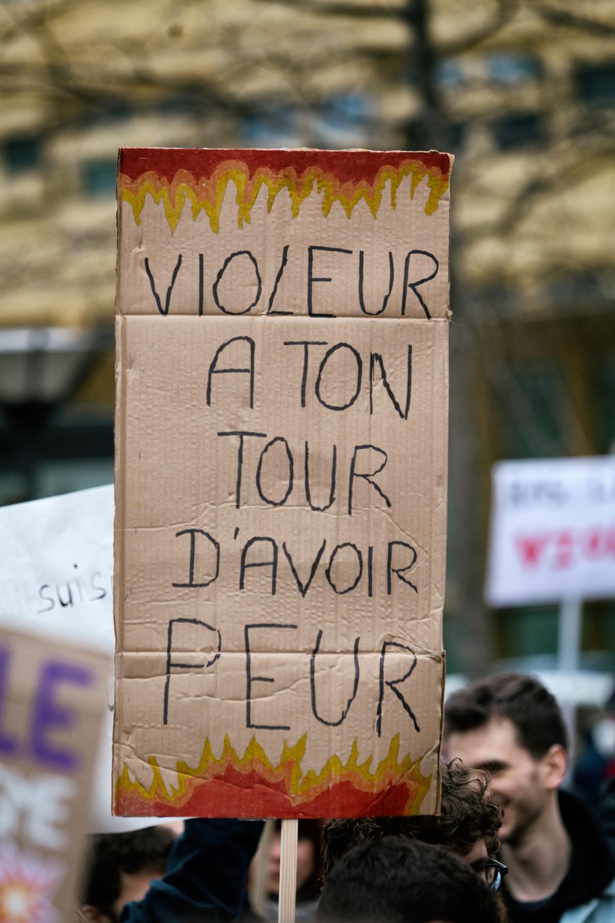 Sign: rapist now it's your turn to be scared, feminist demonstration "on arrête toutes", Paris, march 8 2020.