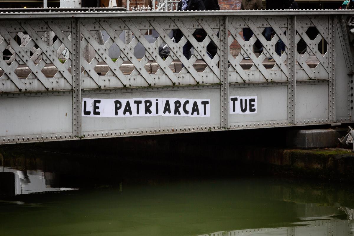 France, Paris, 2021-01-31. A feminist collage on the Crimean bridge with the slogan "The patriarchy kills". Photograph by Martin Noda / Hans Lucas.