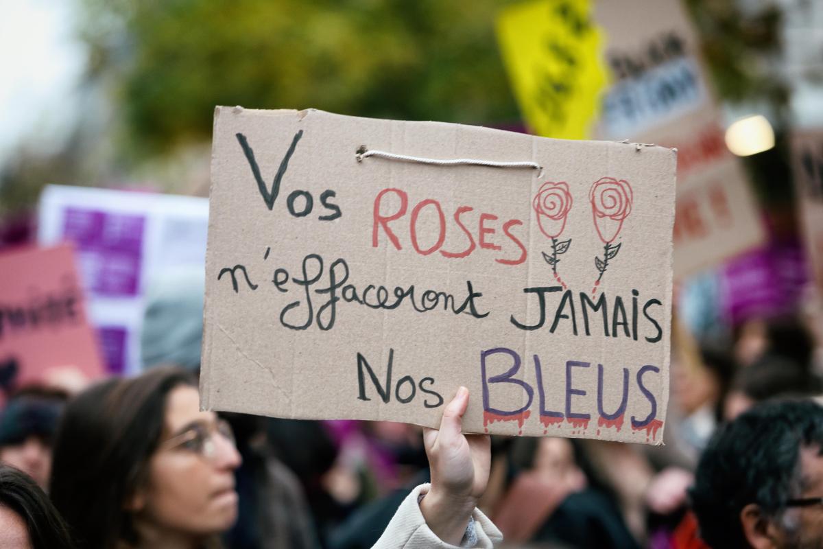 France, Paris, 2021-11-20. A placard with the slogan "Your roses will never erase our bruises". Demonstration against violence against women. Photograph by Martin Noda / Hans Lucas