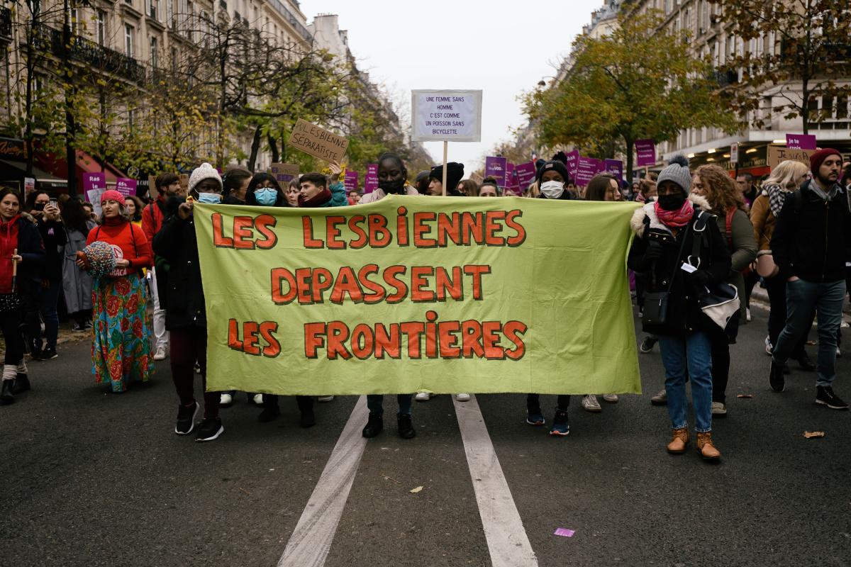 France, Paris, 2021-11-20. A banner with the slogan "Lesbians cross borders". Demonstration against violence against women. Photograph by Martin Noda / Hans Lucas