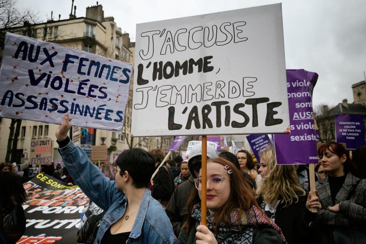 Une manifestante avec sa pancarte: J'accuse l'homme, j'emmerde l'artiste, manifestation feministe "on arrete toutes", Paris, 8 mars 2020.