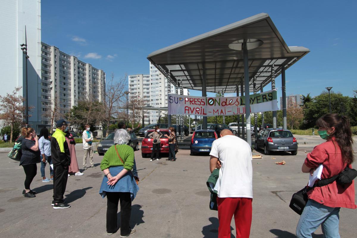 Saint-Denis, quartier de Franc Moisin, le 17 mai 2020 à 15h, le collectif des habitants de Franc Moisin installe une banderole sur la Place Rouge au milieu de la cité. Le mot d'ordre "La suppression du loyer avril, mai et juin" le temps de la crise sanitaire.Elle a été réalisée en petits bouts par divers locataires puis cousus ensemble pour former la banderole finale.
