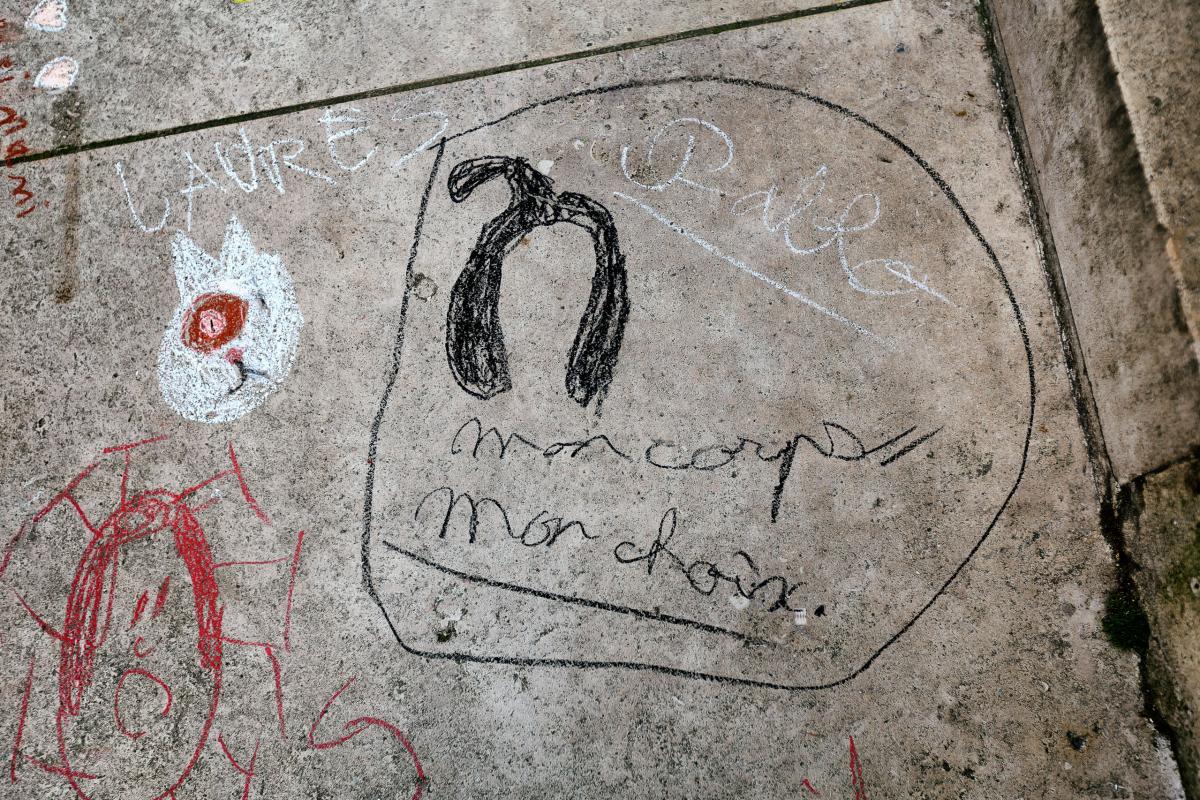 France, Paris, 2021-04-17. A child wrote a feminist slogan "My body, my choice" in chalk. Agora of the Odeon occupants with the Ibis chambermaids in struggle. Photograph by Martin Noda / Hans Lucas