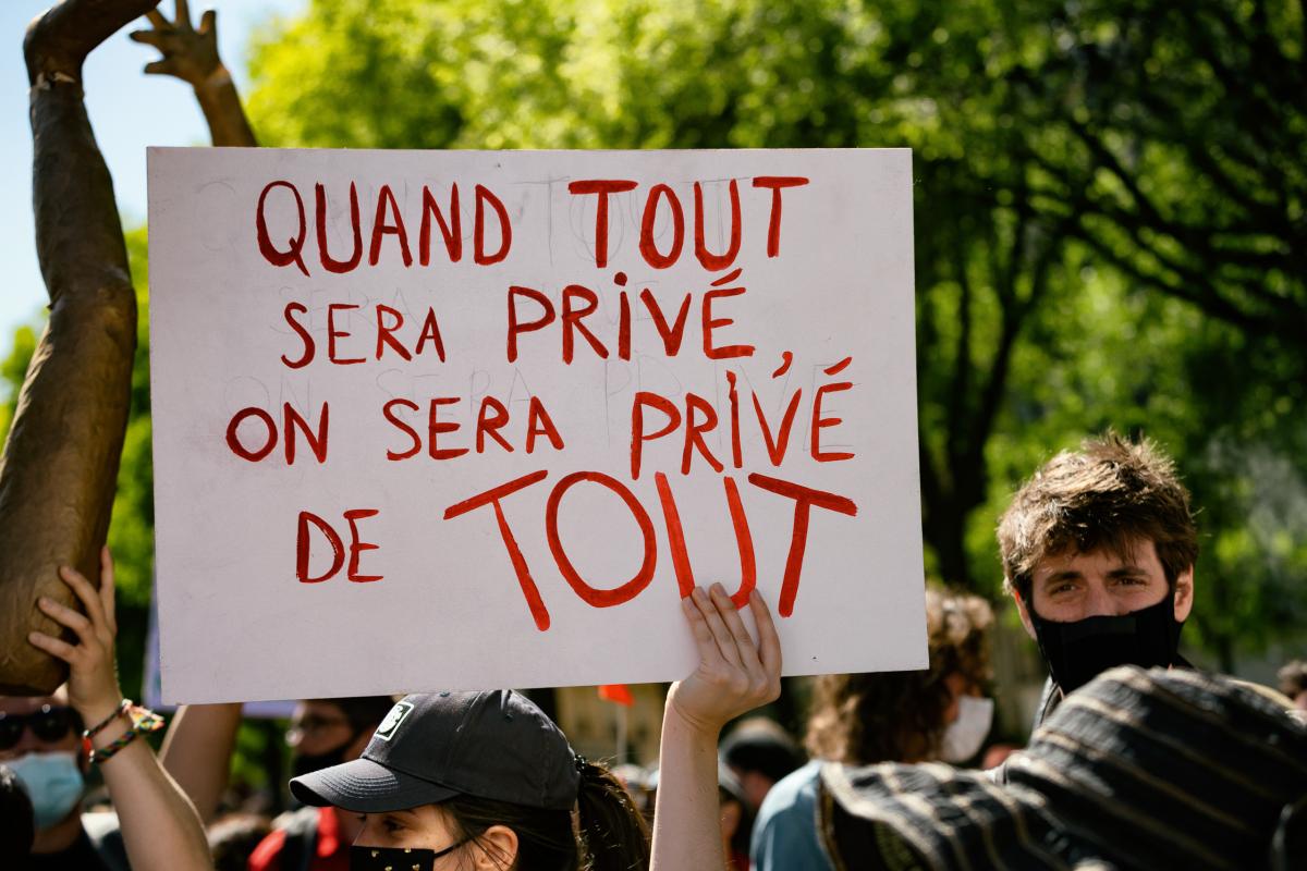 A sign with the slogan "when everything is private, we will be deprived of everything". Demonstration called by the occupants of the Odeon theatre against the reform of the unemployment insurance, Paris, April 23 2021. Photograph by Martin Noda / Hans Lucas
