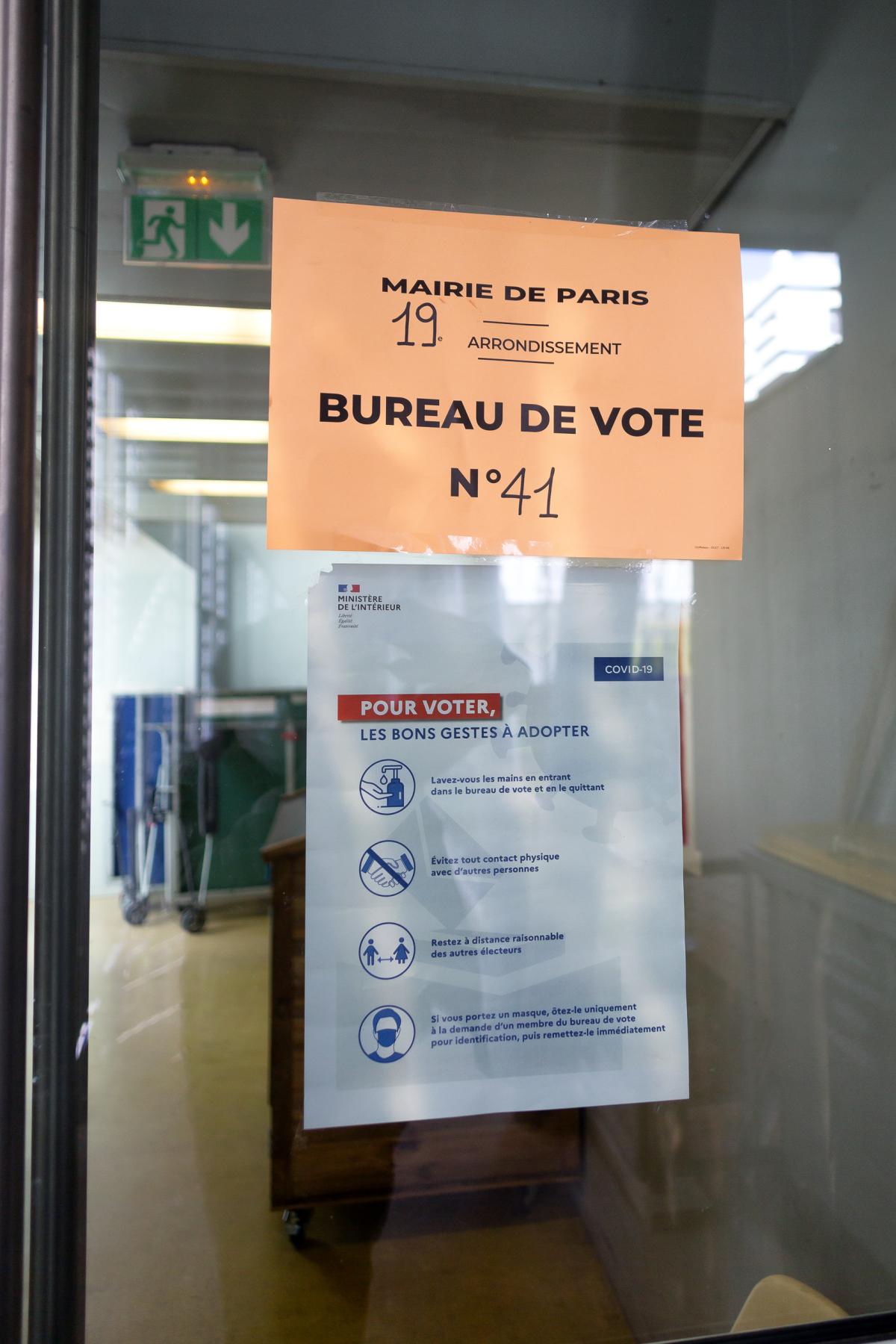 Des affiches expliquant, les mesures de securite pour eviter la transmission du virus lors du premier tour des elections municipales, Paris, 15 mars 2020.