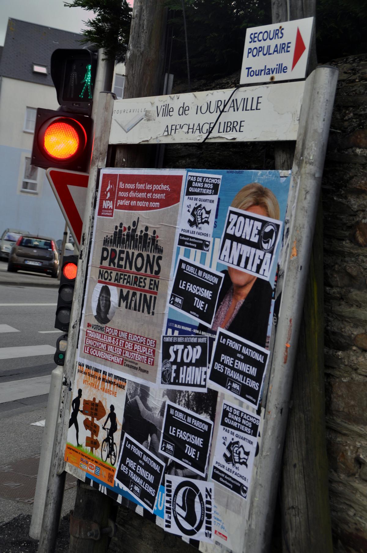 Affiches du FN recouverte par des affiches NPA et antifa