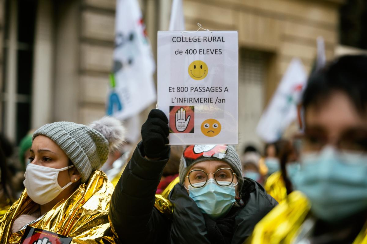 A schollar nurse, demonstration of education worers and students, Paris, January 26 2021. Photograph by Martin Noda / Hans Lucas
