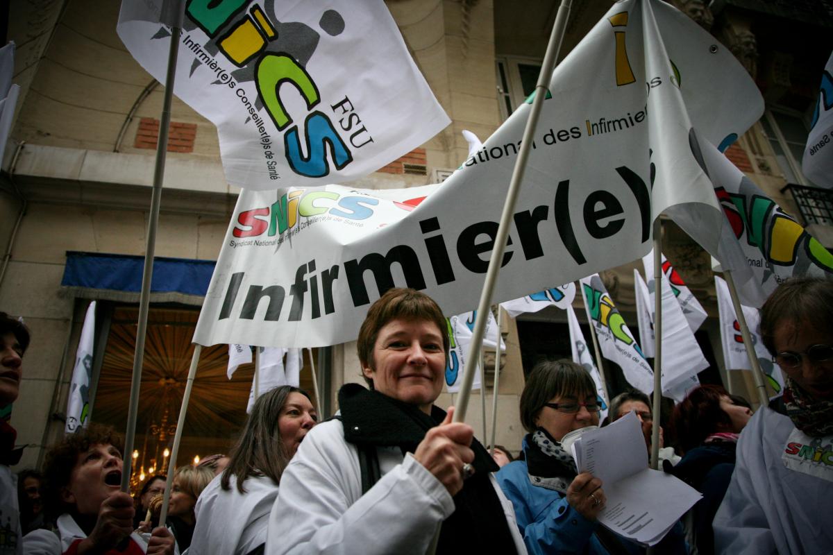 Paris, le 10 janvier 2012. Pour la cinquième fois, le Syndicat National des Infirmier(e)s et Conseiller(e)s de Santé (SNICS) appelle à une manifestation nationale pour réclamer la revalorisation en catégorie A des infirmières scolaires. 1500 personnes y participeront.