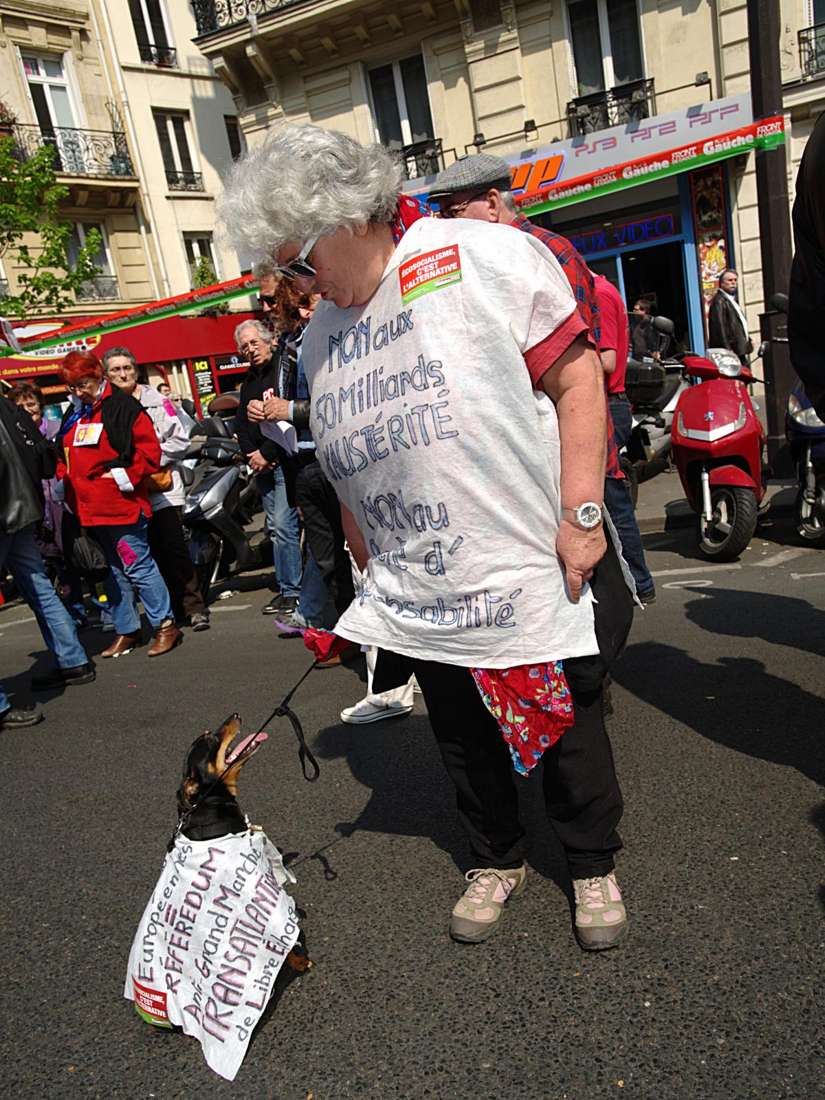 Manifestation contre l'austérité entre République et Nation le 12 avril 2014 à Paris. Deux manifestants complices.