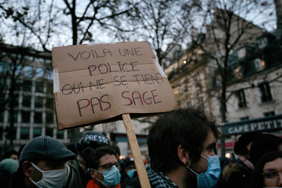 A demonstrator with his placard with the slogan Here comes a police force that doesn t behave well, demonstration against separatism and global security laws, Paris, December 12 2020. Photograph by Martin Noda / Hans Lucas
