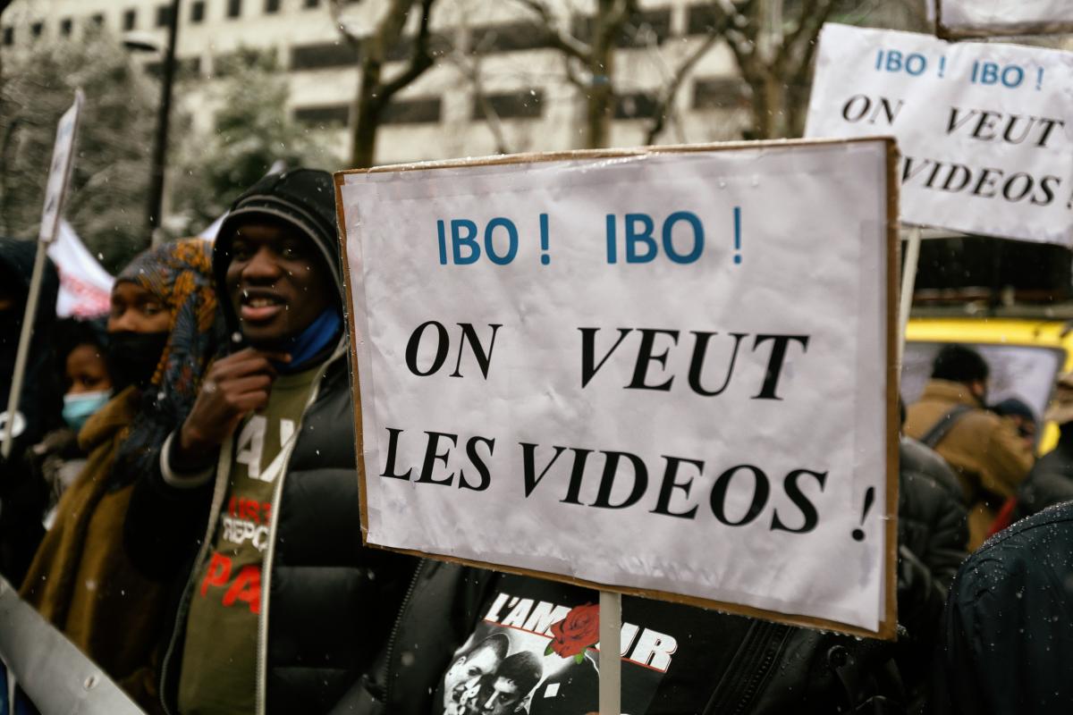 Une pancarte demandant l apparition des videos qui auraient pu montrer ce qui s est passe lors de la mort de Ibrahima Bah, Ibo, manifestation contre la loi de securite globale, Paris, 16 janvier 2020. Photographie de Martin Noda / Hans Lucas