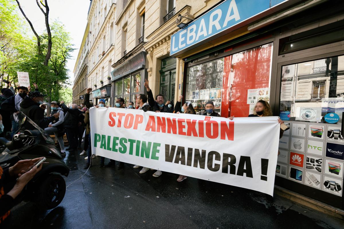 France, Paris,2021-05-15. Demonstrators with a banner with the slogan "Stop annexation Palestine will win". This banner was violently confiscated by the police a few moments later. Demonstration in support of Palestine maintained despite its ban. Photograph by Martin Noda / Hans Lucas