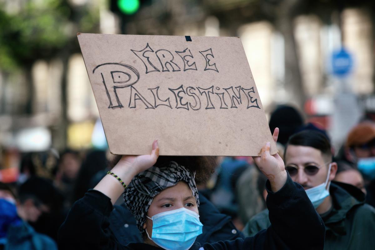 France, Paris,2021-05-15. A demonstrator with a placard with the slogan "Free Palestine". Demonstration in support of Palestine maintained despite its ban.. Photograph by Martin Noda / Hans Lucas
