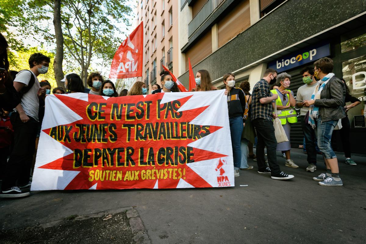 NPA youth banner in support of workers, Biocoop workers rally against mandatory Sunday work, Paris, September 6 2020. Photograph by Martin Noda / Hans Lucas