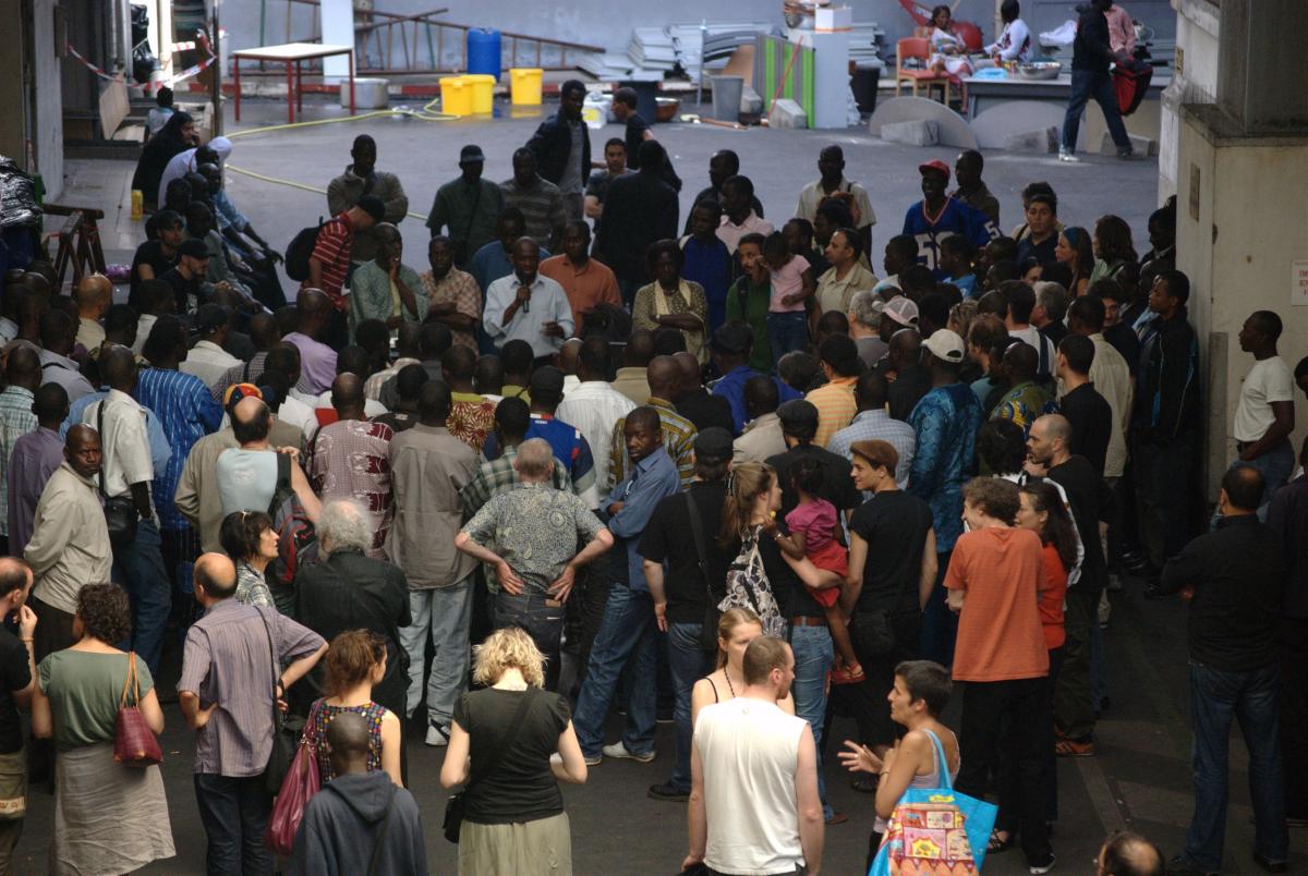 Les occupants et les soutiens écoutent les prises de parole.