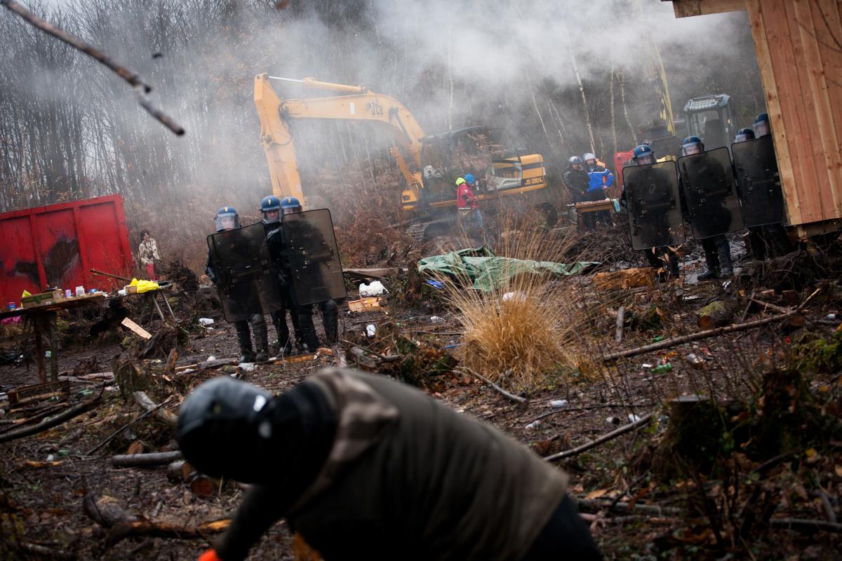 Vendredi 23 novembre, des affrontements eclatent entre opposants au projet d'aeroport grand-ouest de Notre-Dame des Landes et les gardes mobiles, autour des constructions erigees suite a la manifestation de reoccupation du 17 novembre. Grenades lacrymogenes, grenades assourdissantes et flashball repondent au jets de pierre, coktails molotov et bombes de peinture.