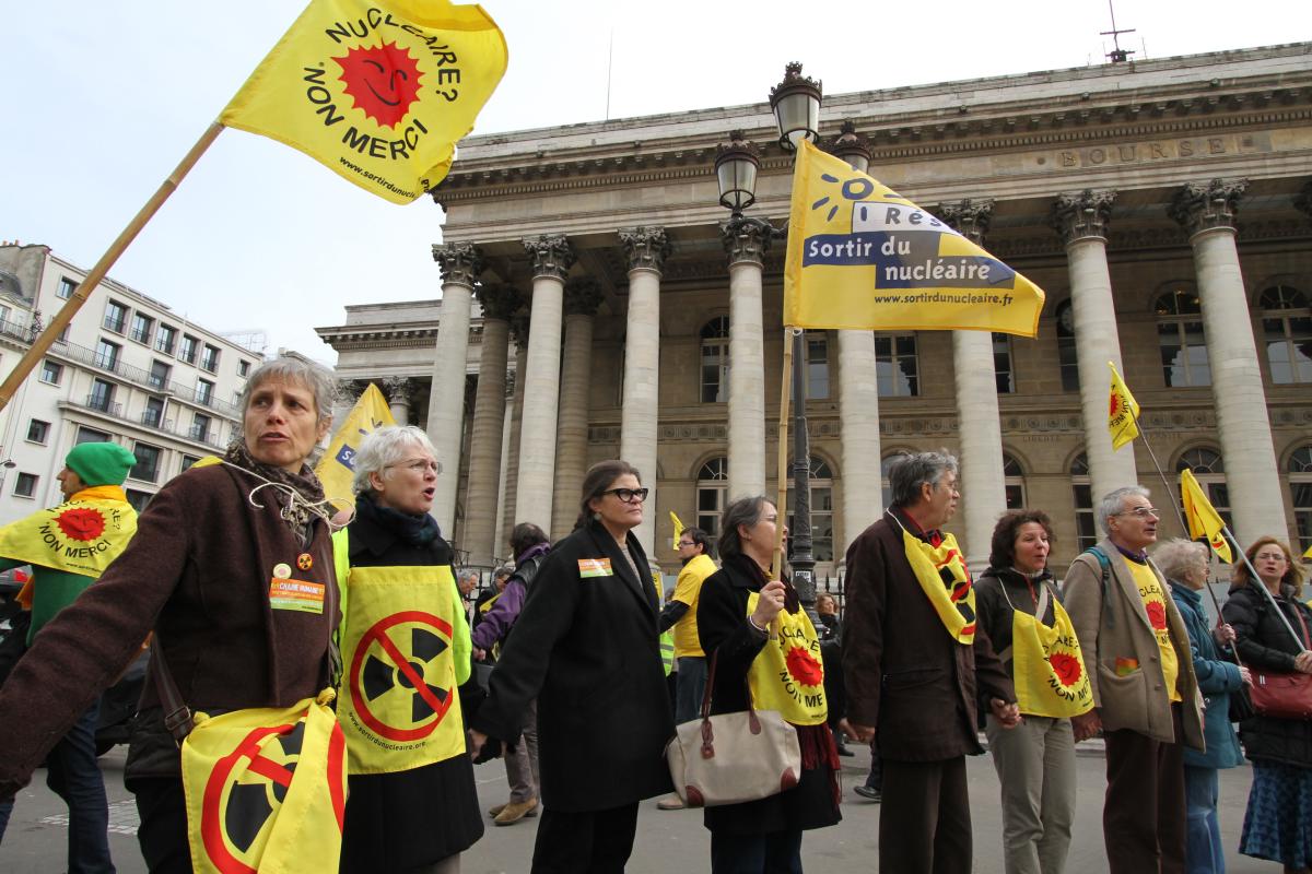 Mardi 5 mars 2013, Paris, conférence de presse de Sortir du Nucléaire et mini chaine humaine devant la Bourse pour annoncer la mobilisation du samedi 9 mars 2013