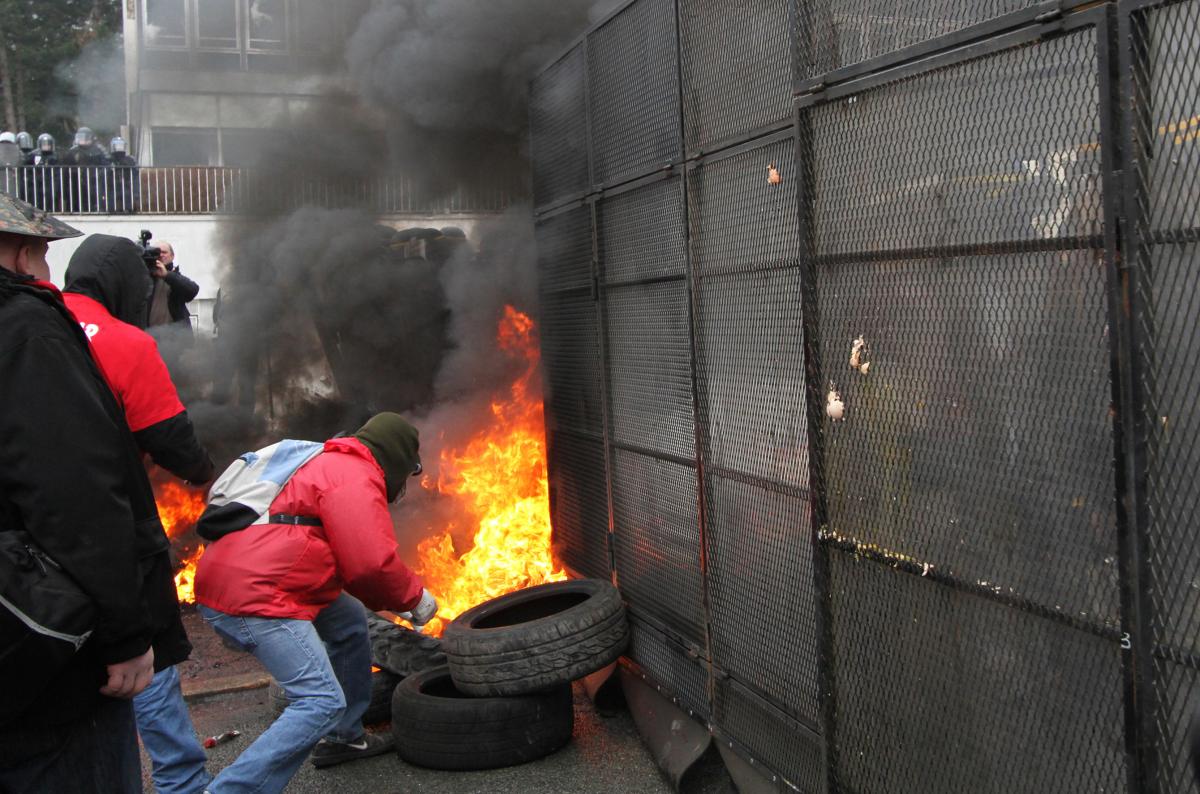 Le 7 mars 2013, rassemblement des salariés de Goodyear devant le siège de l'entreprise à Rueil Malmaison, à l'occasion d'une réunion du CE où doit être rendu le rapport des experts sur la situation du groupe.
